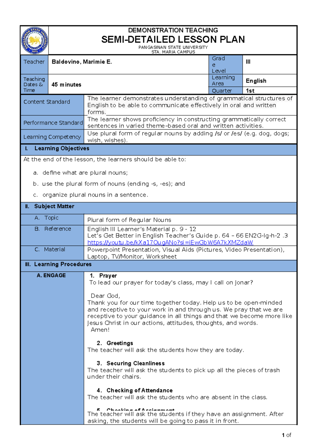 Semi-Detailed Lesson Plan - BSED English - PangSU - Studocu
