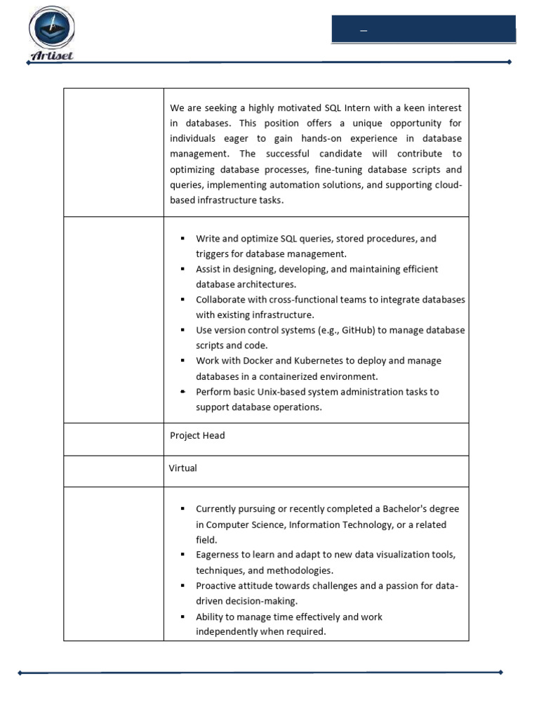 SQL Developer Intern Job Description - Responsibilities & Skills