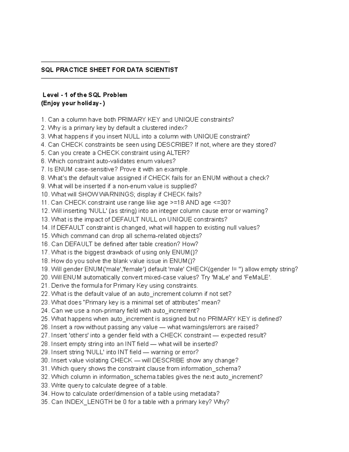 SQL PRACTICE SHEET FOR DATA SCIENTISTS - Level 1 Problems - Studocu