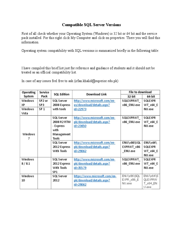 Compatible SQL Server Versions: Operating System Service Pack SQL ...