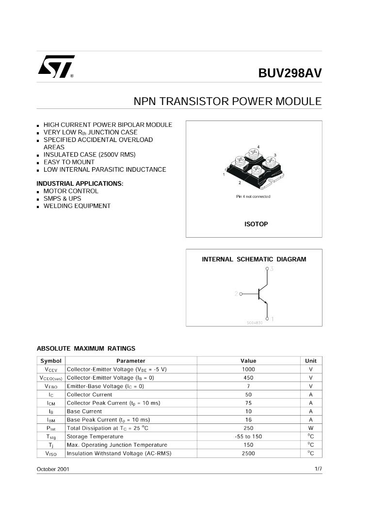 BUV 298AV NPN Transistor Power Module - ST-Microelectronics (Obsolete ...