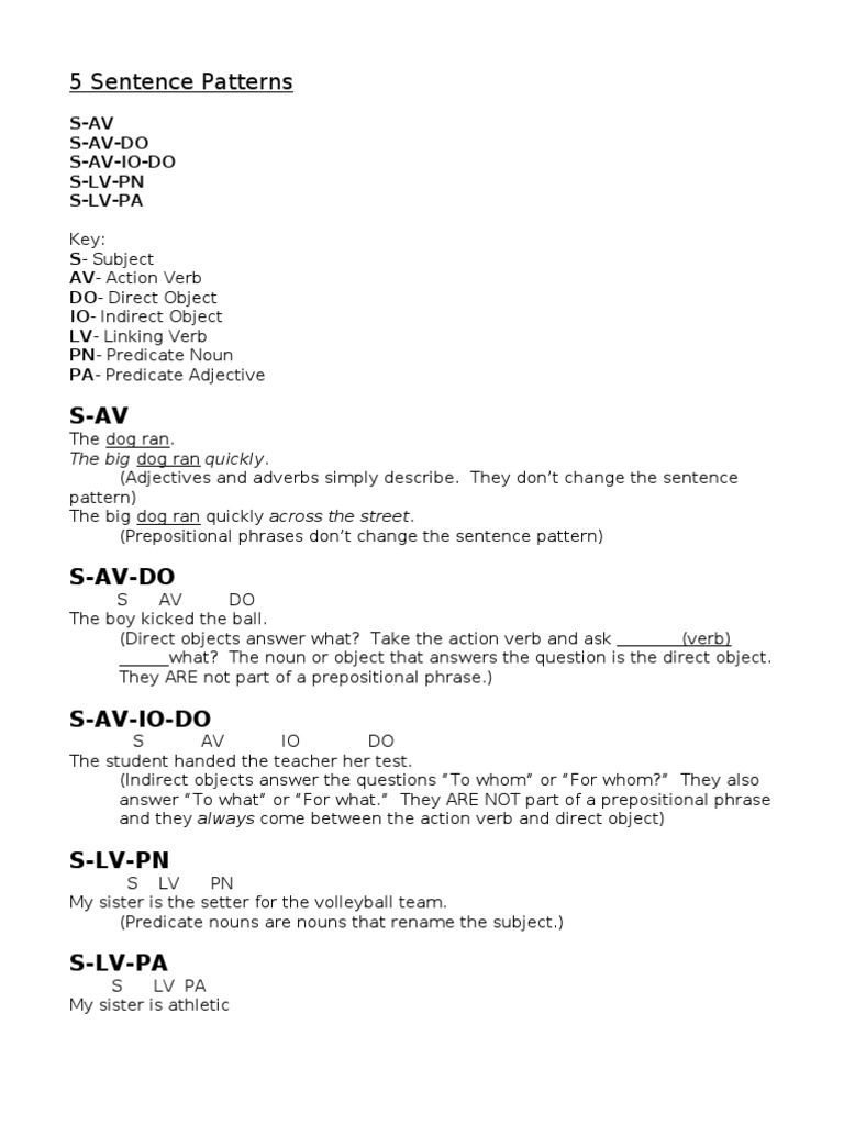 5 Sentence Patterns: S-Av S-Av-Do S-Av-Io-Do S-LV-PN S-Lv-Pa | PDF