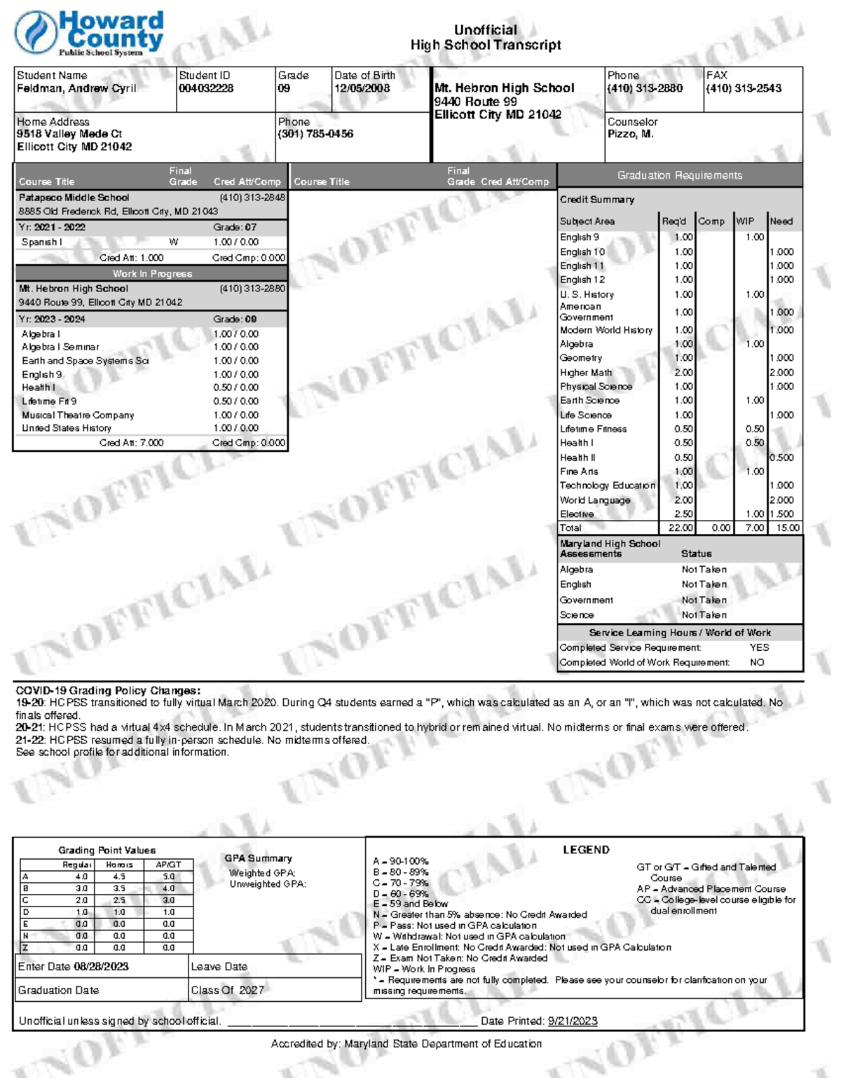 Transcript 2023-2024 - 55fhbgd - Student Name Feldman, Andrew Cyril ...