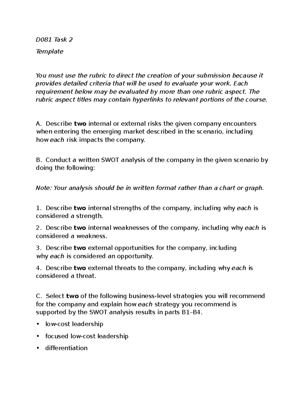 D081 Task 2 Template - Risk Analysis and SWOT Outline - Studocu