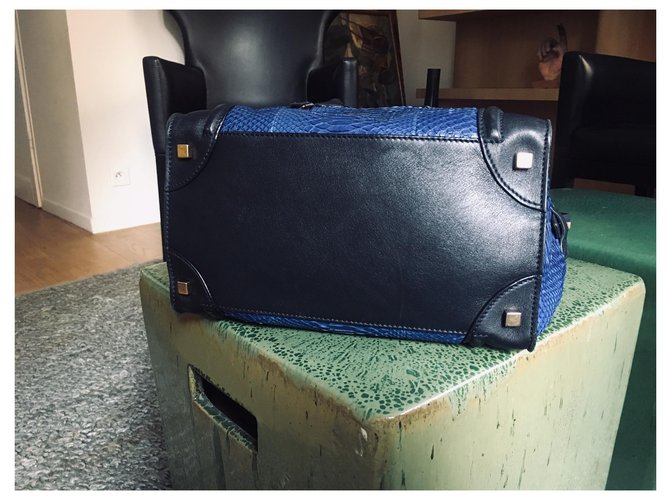 Superbe et rare sac Céline Luggage bicolore en Python bleu Cuirs ...