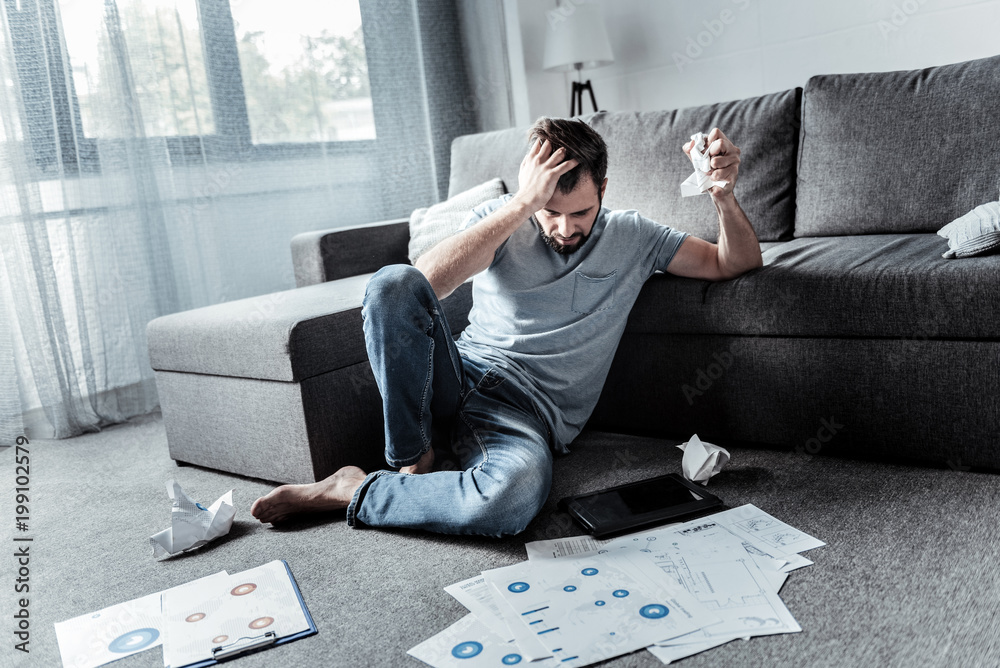Emotional outburst. Depressed unhappy sad man sitting on the floor and ...