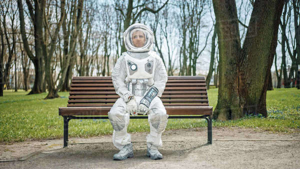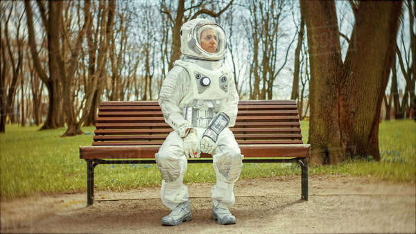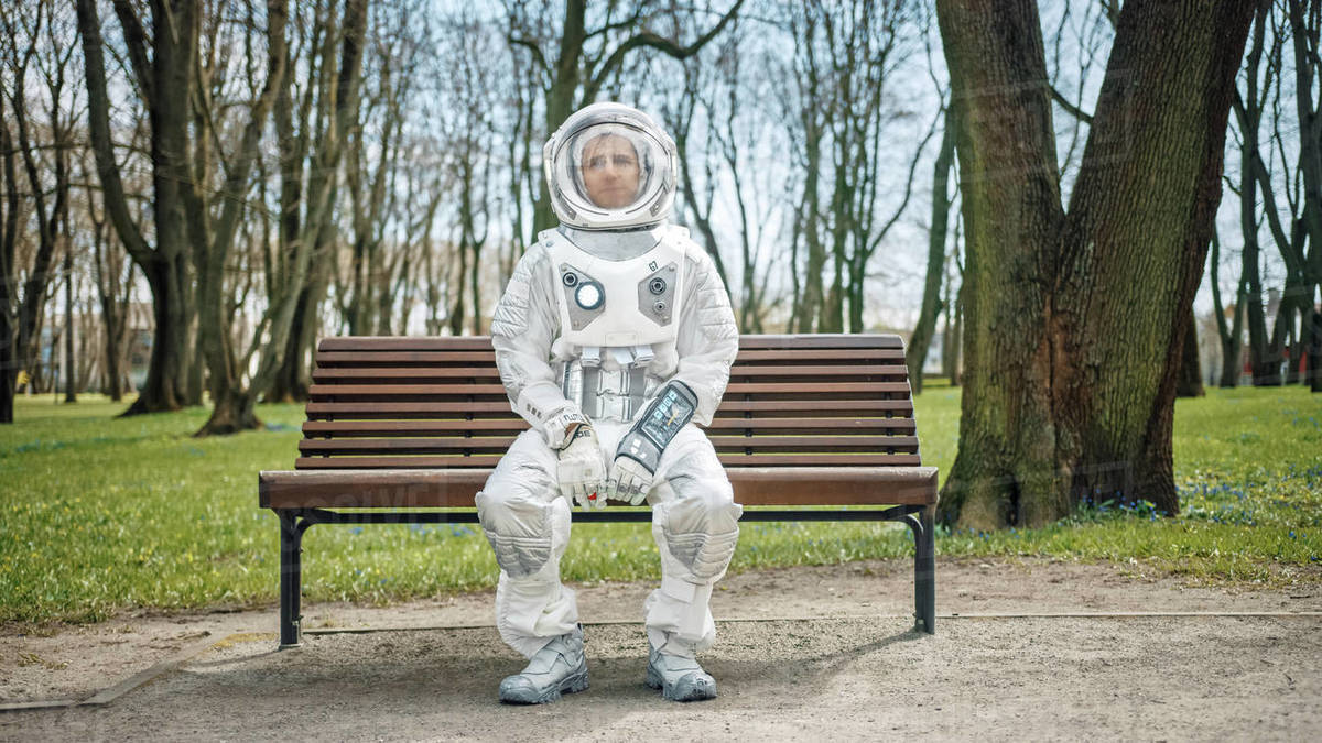 Sad Man in Spacesuit is Sitting on Wooden Bench Miserable Astronaut ...