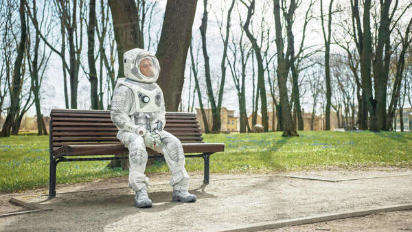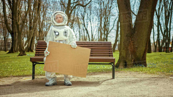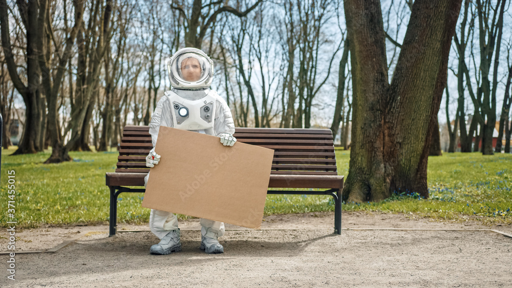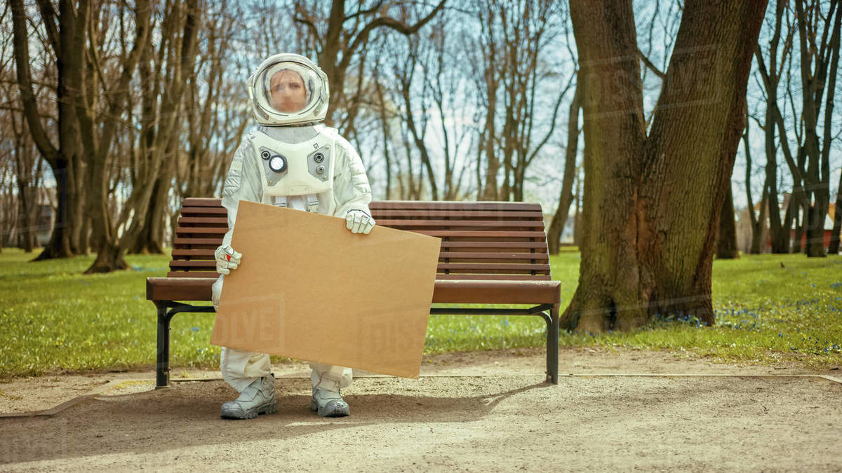 Sad Man In Spacesuit Is Sitting On A Bench In A Park And Holding A ...