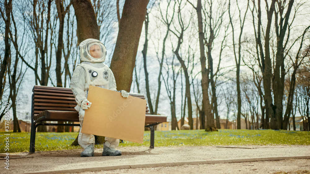 Sad Man in Spacesuit is Sitting on a Bench in a Park. Miserable ...