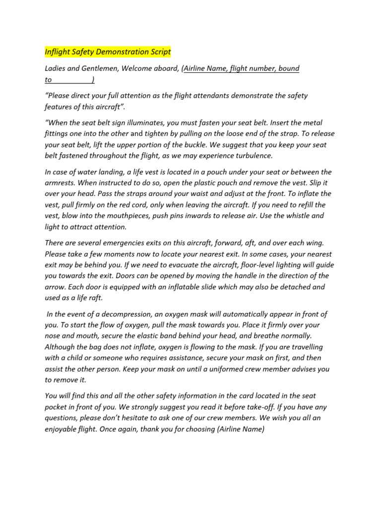 Inflight Safety Demonstration Script | PDF