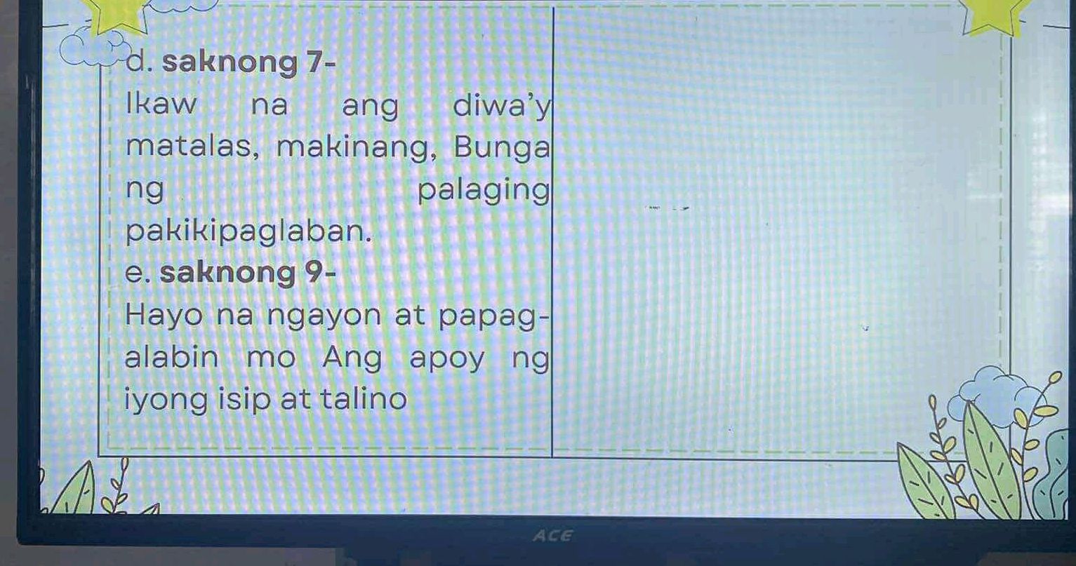 gumawa ng isang tula na may 5 saknong at 4 na taludtod na magpapakita ...