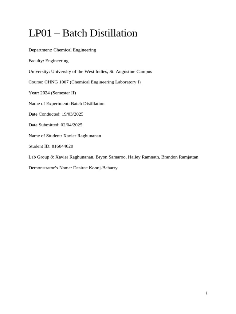 Experiment 1 Simple Batch Distillation - LABORATORY REPORT CHEMICAL ...