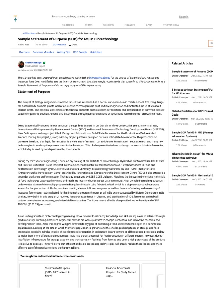 SOP For BioTechnology - Statement of Purpose - Guide&Sample