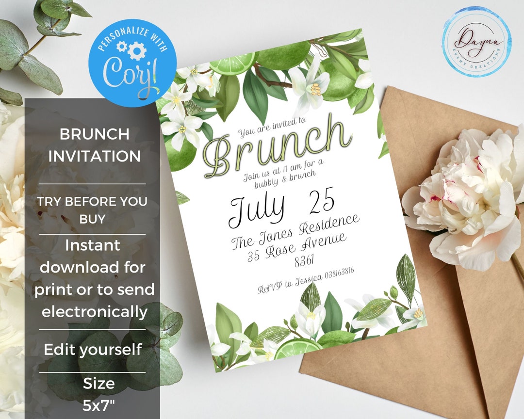 Editable Floral Brunch Invitation Template | Lime Brunch Party Invite ...