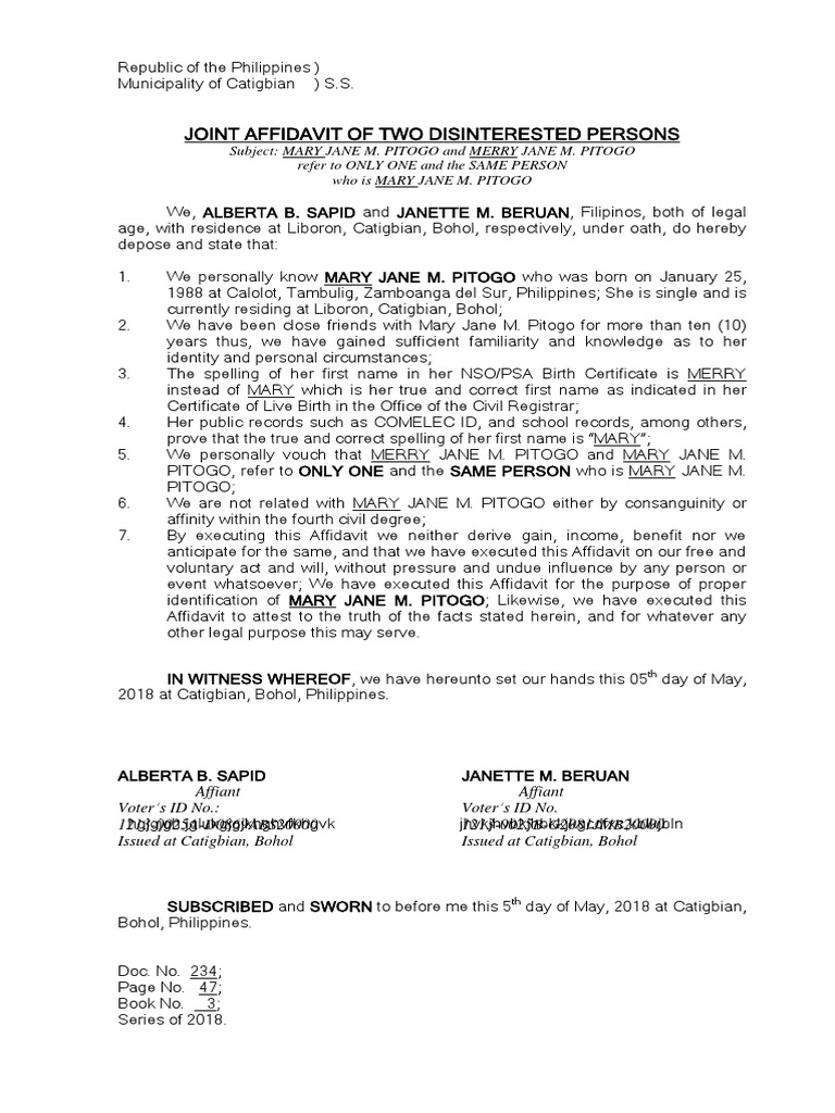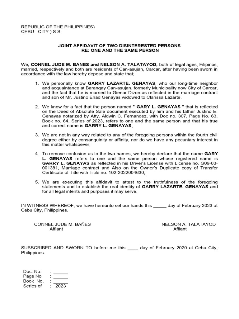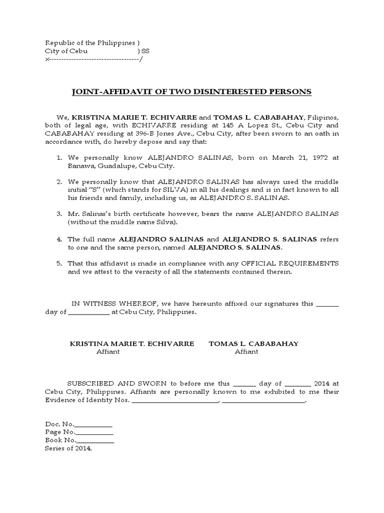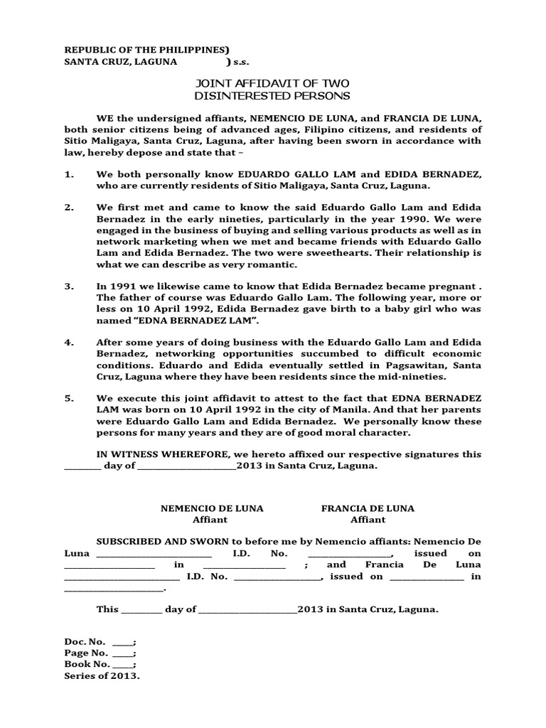 Sample Joint Affidavit of Two Disinterested Persons | PDF | Affidavit ...