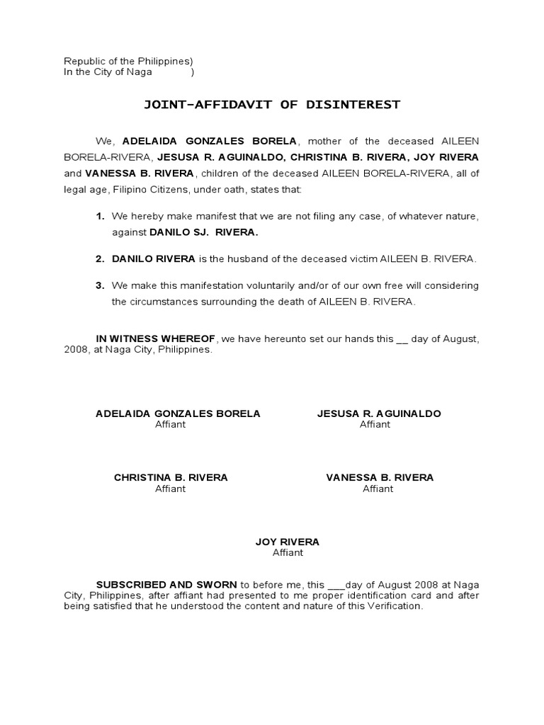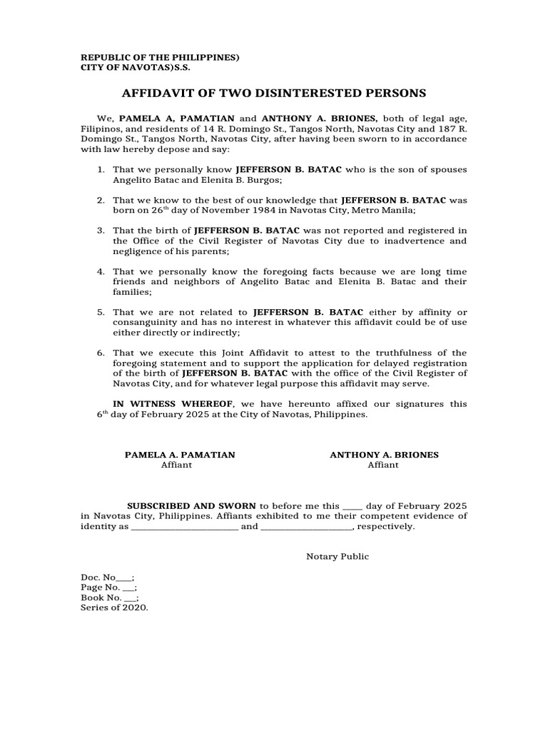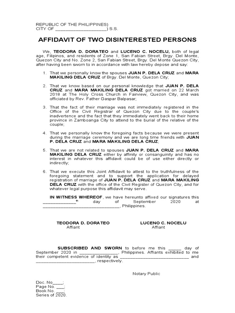 Affidavit of Two Disinterested Persons - Sample | PDF | Affidavit ...