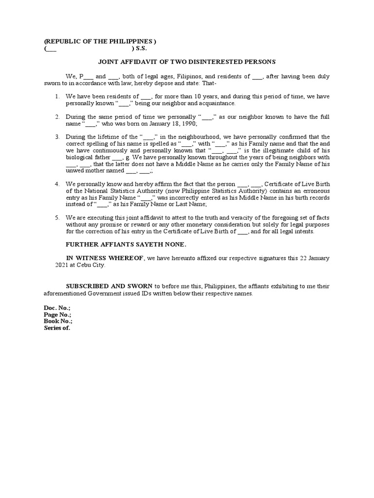 JOINT AFFIDAVIT OF TWO DISINTERESTED PERSONS-sample | PDF | Affidavit ...