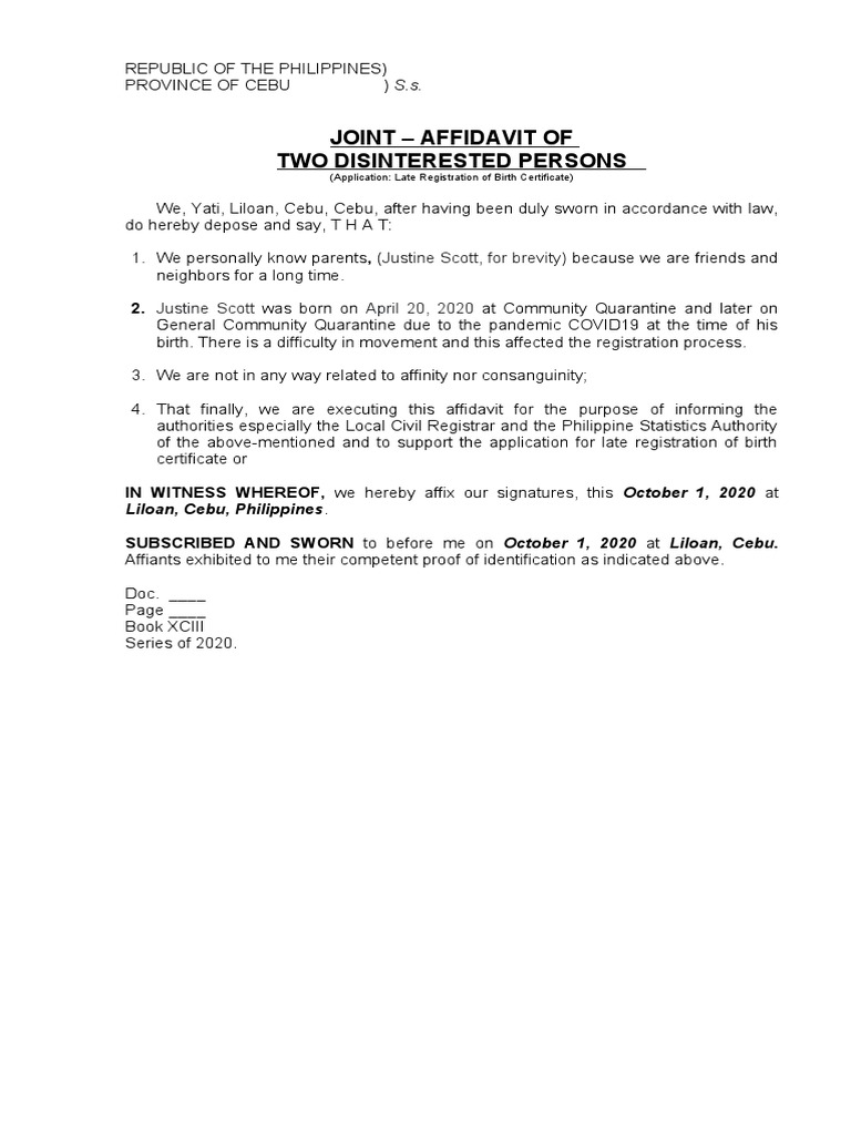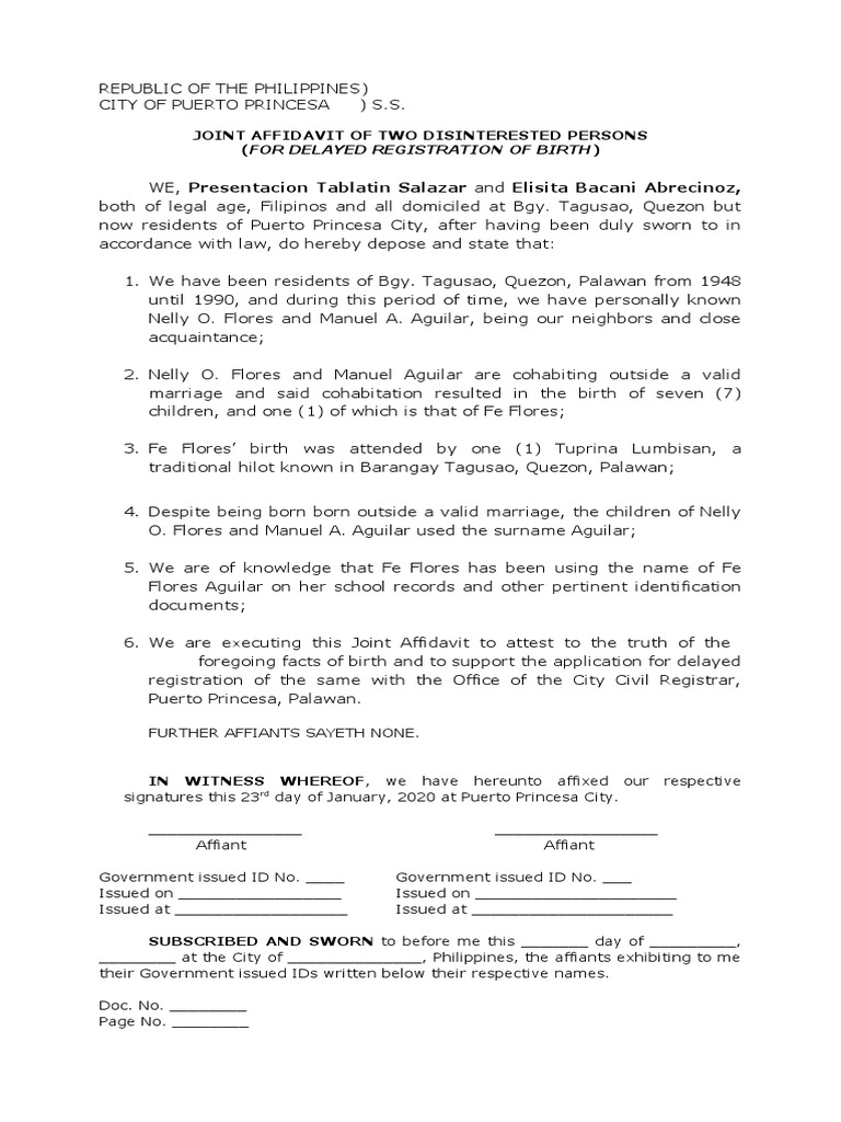 Sample Joint Affidavit of Two Disinterested Persons For Delayed Birth ...