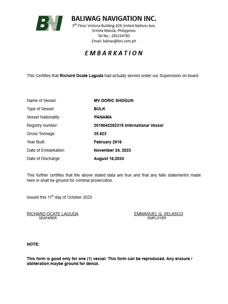 Baliwag Navigation Inc.: Embarkation | PDF