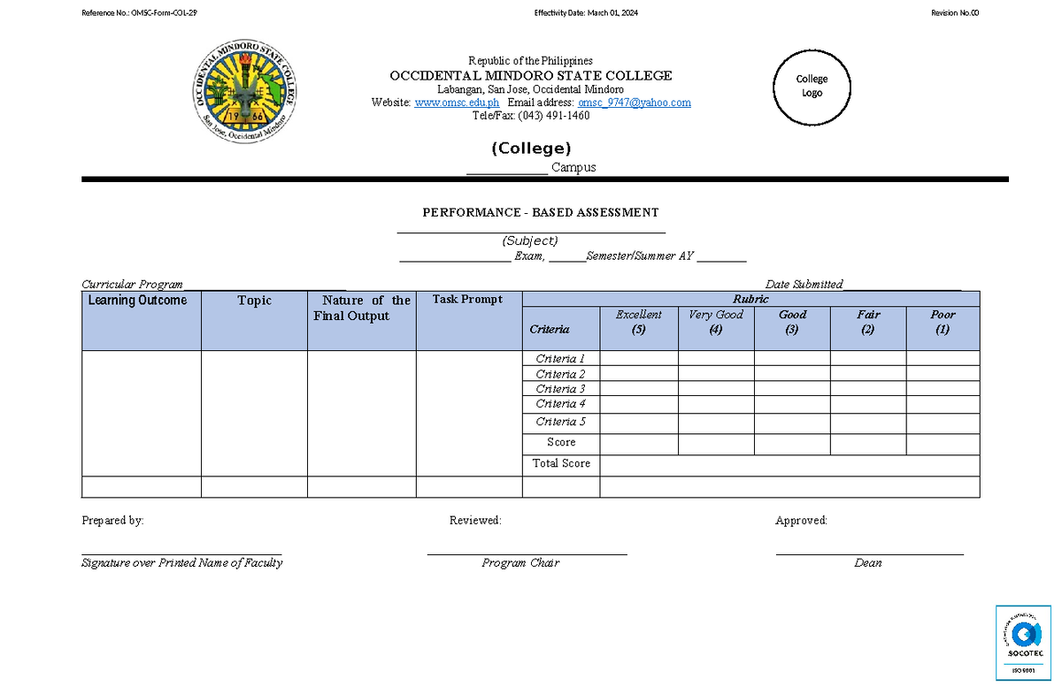 OMSC-Form-COL-29-Performance-Based-Assessment Rev - Reference No.: OMSC ...