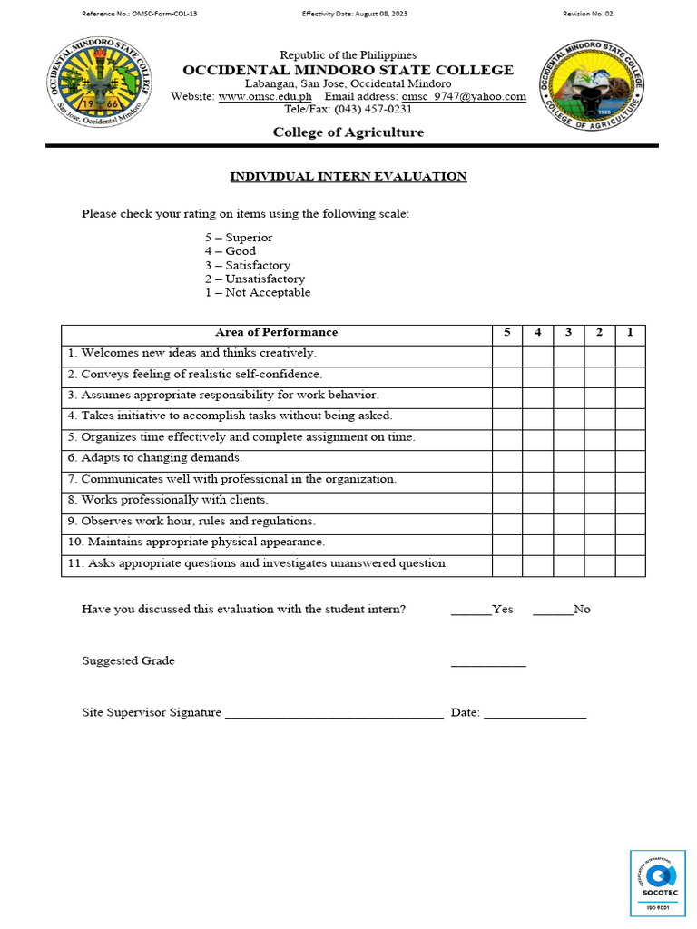 OMSC-Form-COL-21 Individual Intern Evaluation - Rev.02 | PDF