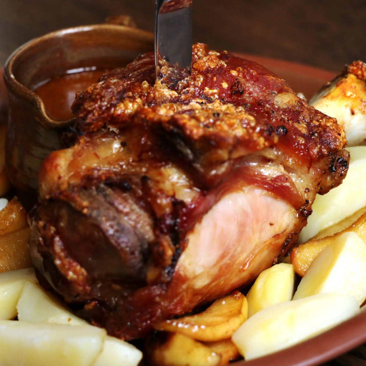 Knusprige Haxe mit Biersoße aus dem Backofen. Leckere Hausmannskost ...