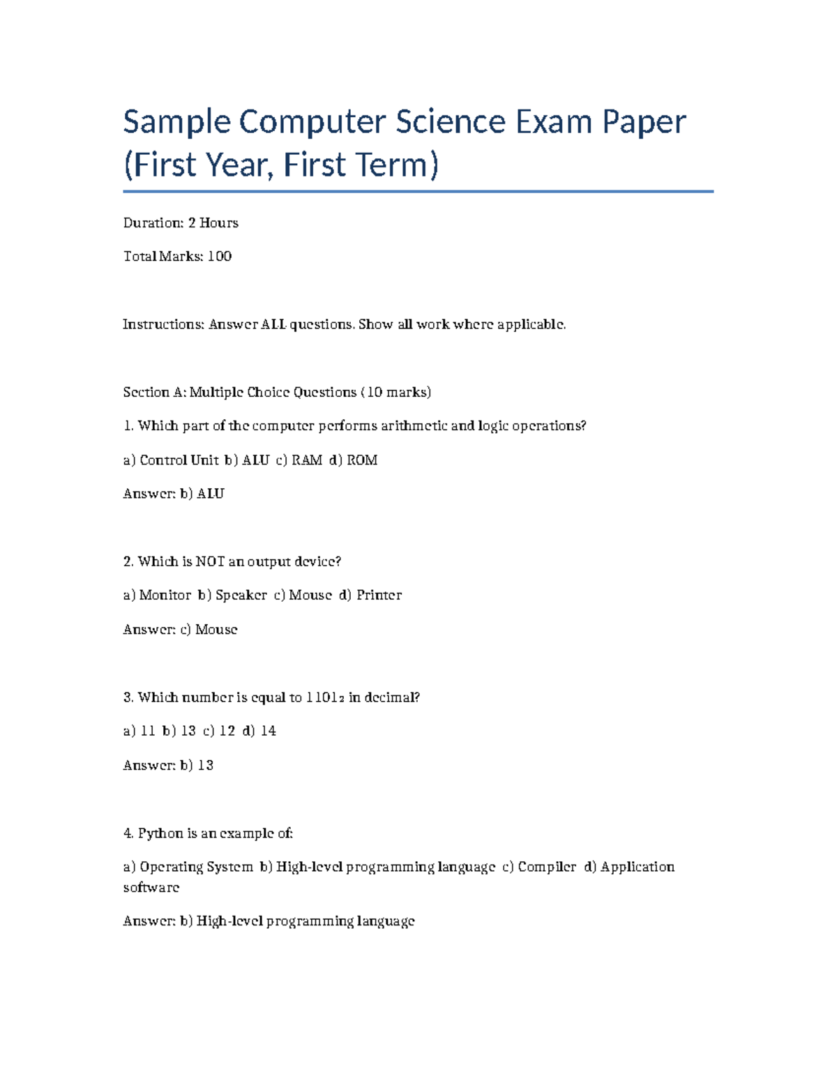 Sample CS101 Exam Paper - Computer Science (1st Year, 1st Term) - Studocu
