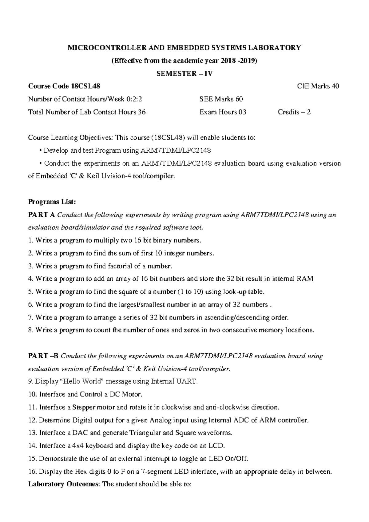 Subject:: Microcontroller and Embedded Systems Laboratory 18CSL48 2 0:2 ...