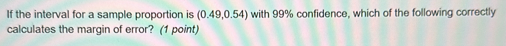 Solved: If the interval for a sample proportion is (0.49,0.54) with 99% ...