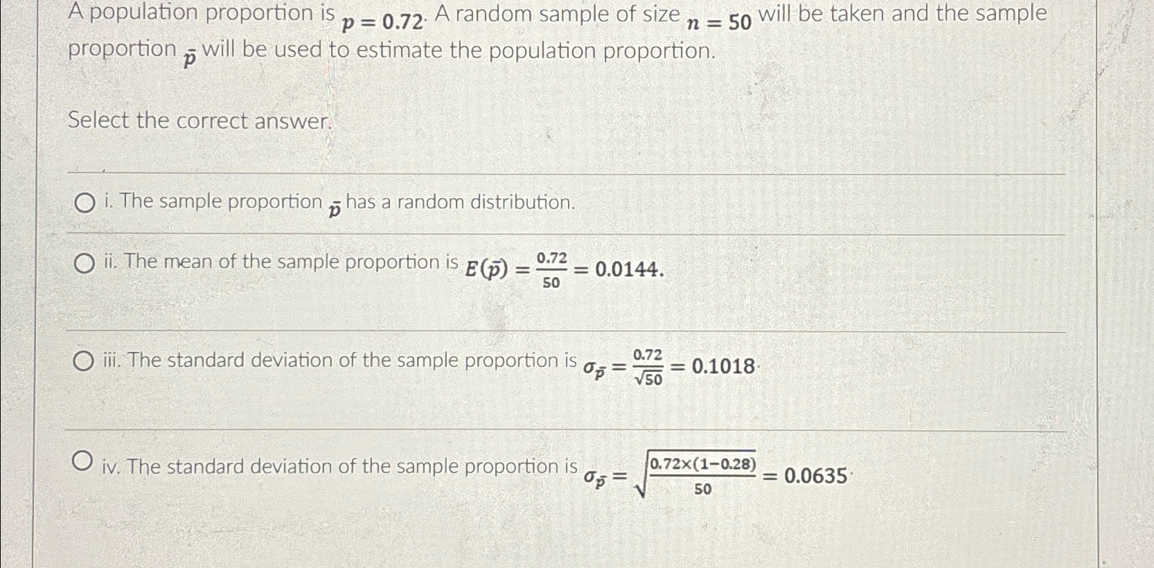 Solved A population proportion is p=0.72. A random sample | Chegg.com