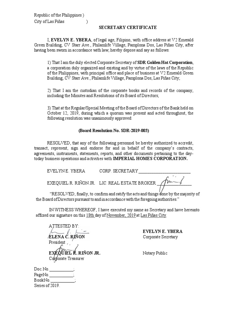 Secretary's Certificate & Board Resolution Sample | PDF