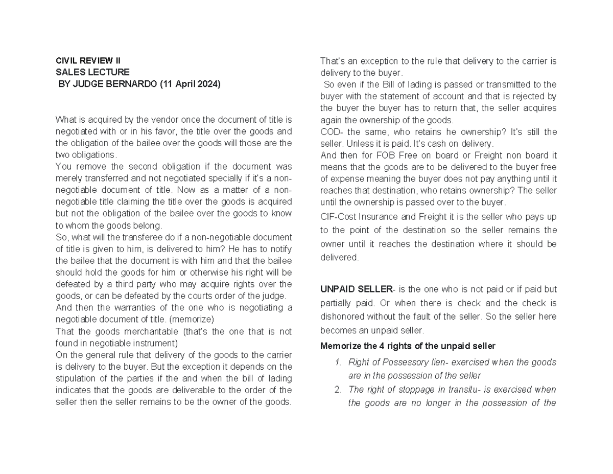 CIVIL REVIEW II SALES LECTURE NOTES - JUDGE BERNARDO (April 2024) - Studocu