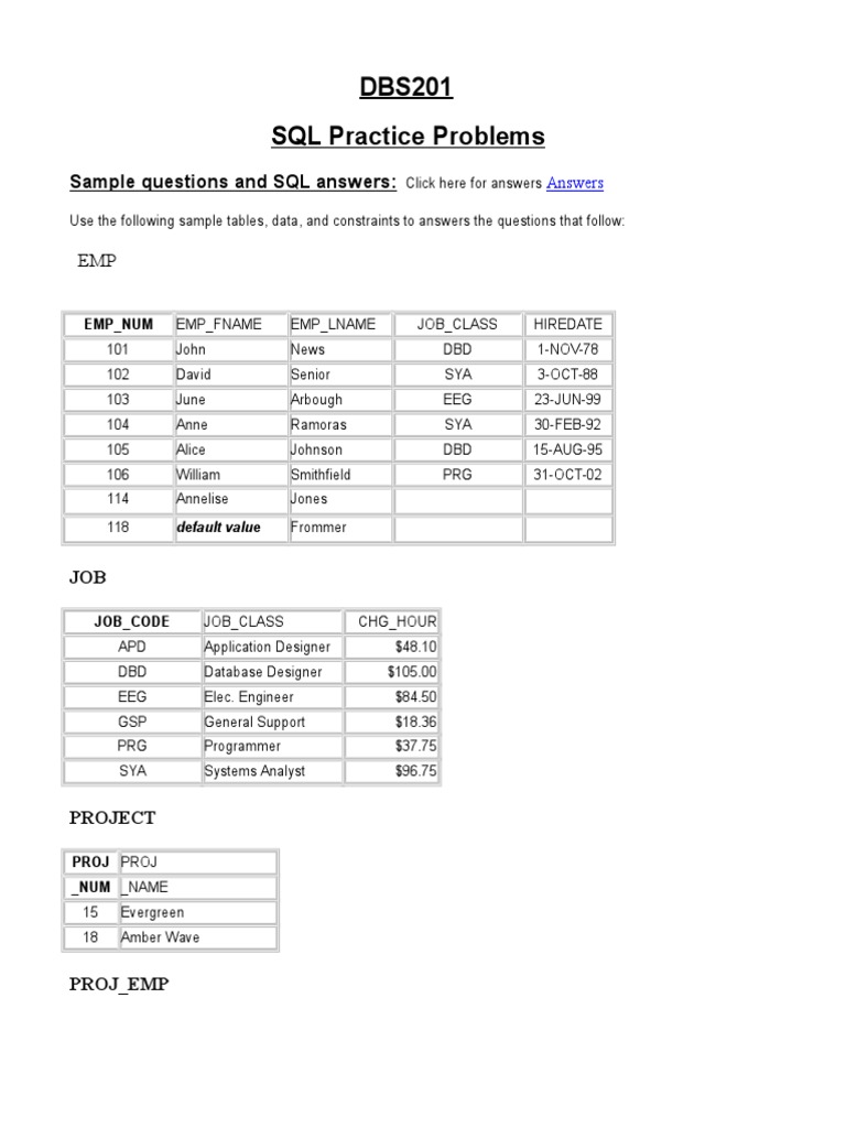 DBS201 SQL Practice Problems: Sample Questions and SQL Answers | PDF ...
