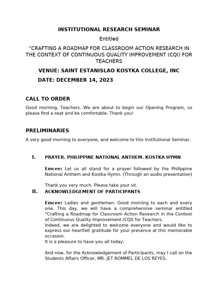 Institutional Research Seminar Master of Ceremony Script | PDF