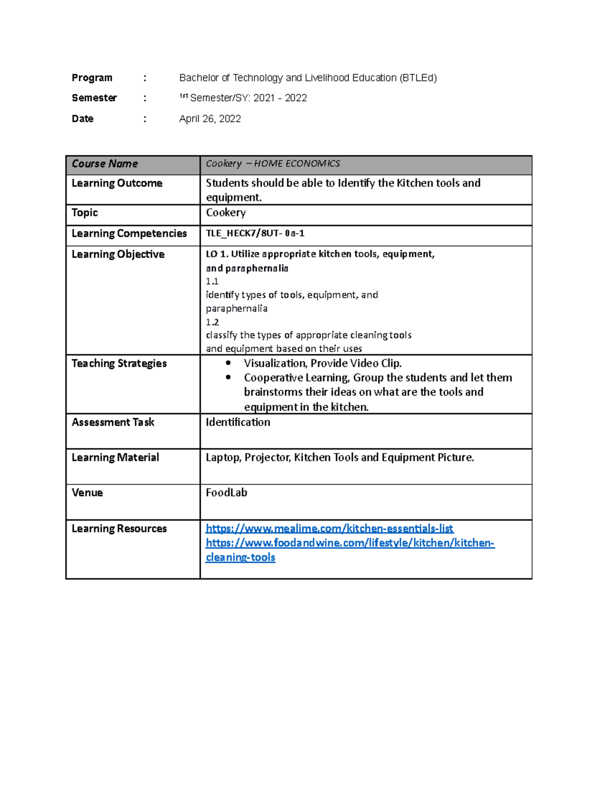 Learning plan in tle - Program : Bachelor of Technology and Livelihood ...