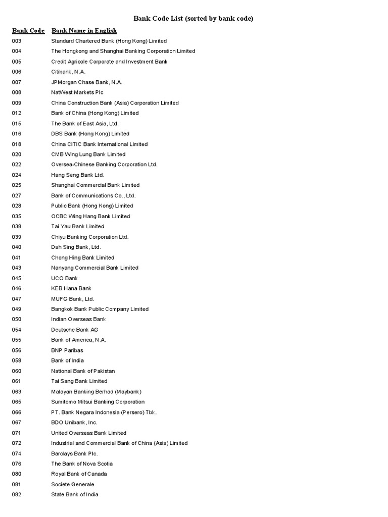 Bank Code List (Sorted by Bank Code) | PDF | Financial Services ...