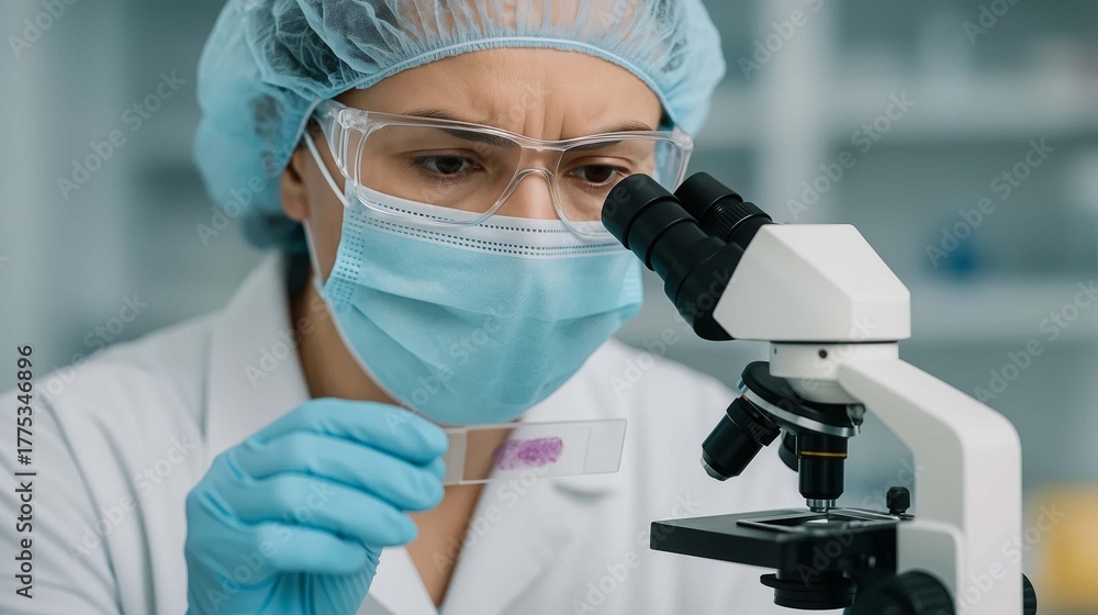 Veterinarian examining a biopsy sample under a microscope in a ...