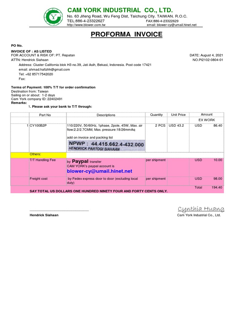 Proforma Invoice: Cam York Industrial Co., LTD | PDF | Payments | Trade