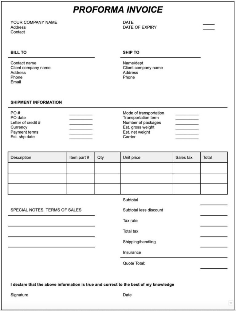 Proforma Invoice Template Free Download word, excel, google docs and sheets