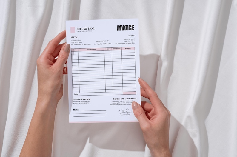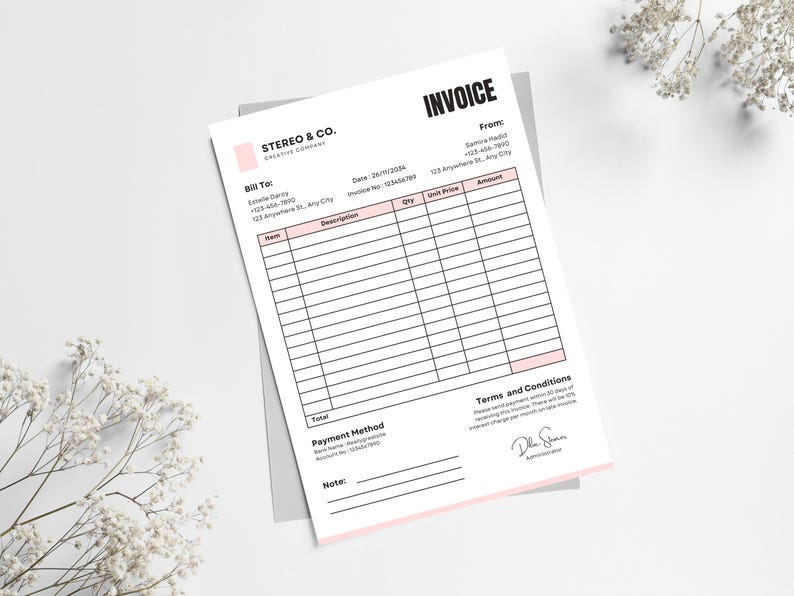 A customizable invoice template displayed on a wooden desk with a lamp ...