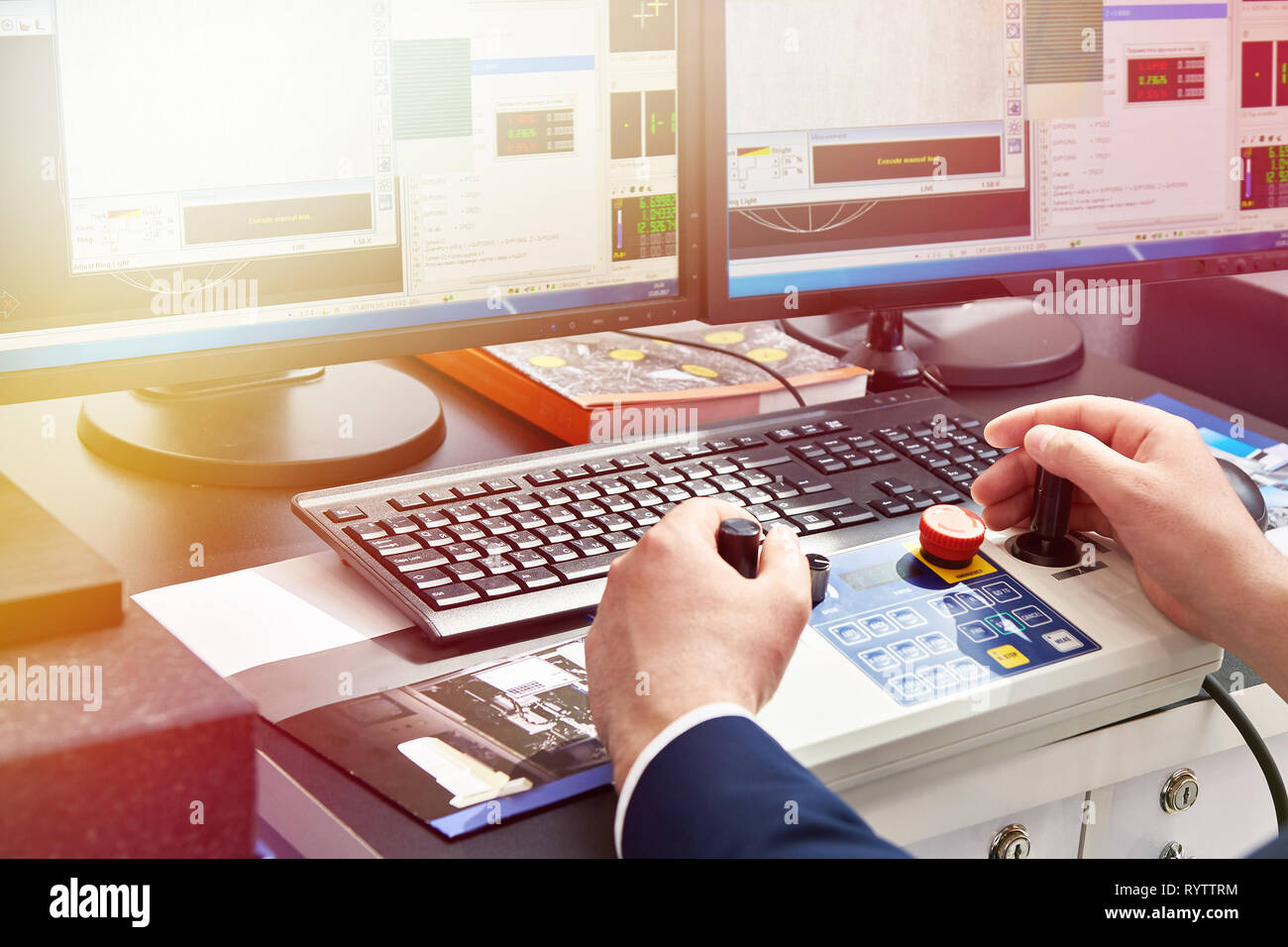 A manufacturing operator works at a machine with a scale and computer ...