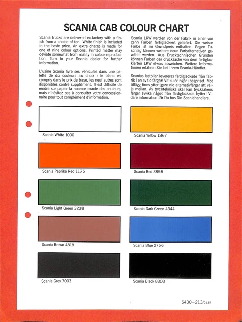 SCANIA TRUCKS / PALETTE DE 10 COULEURS / CAB COLOUR CHART / PROSPECTUS ...