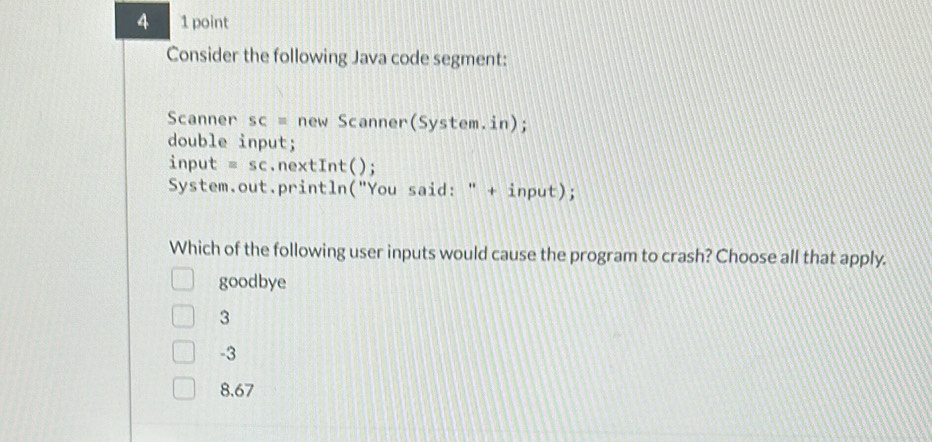 Solved: 4 1 point Consider the following Java code segment: Scanner SC ...