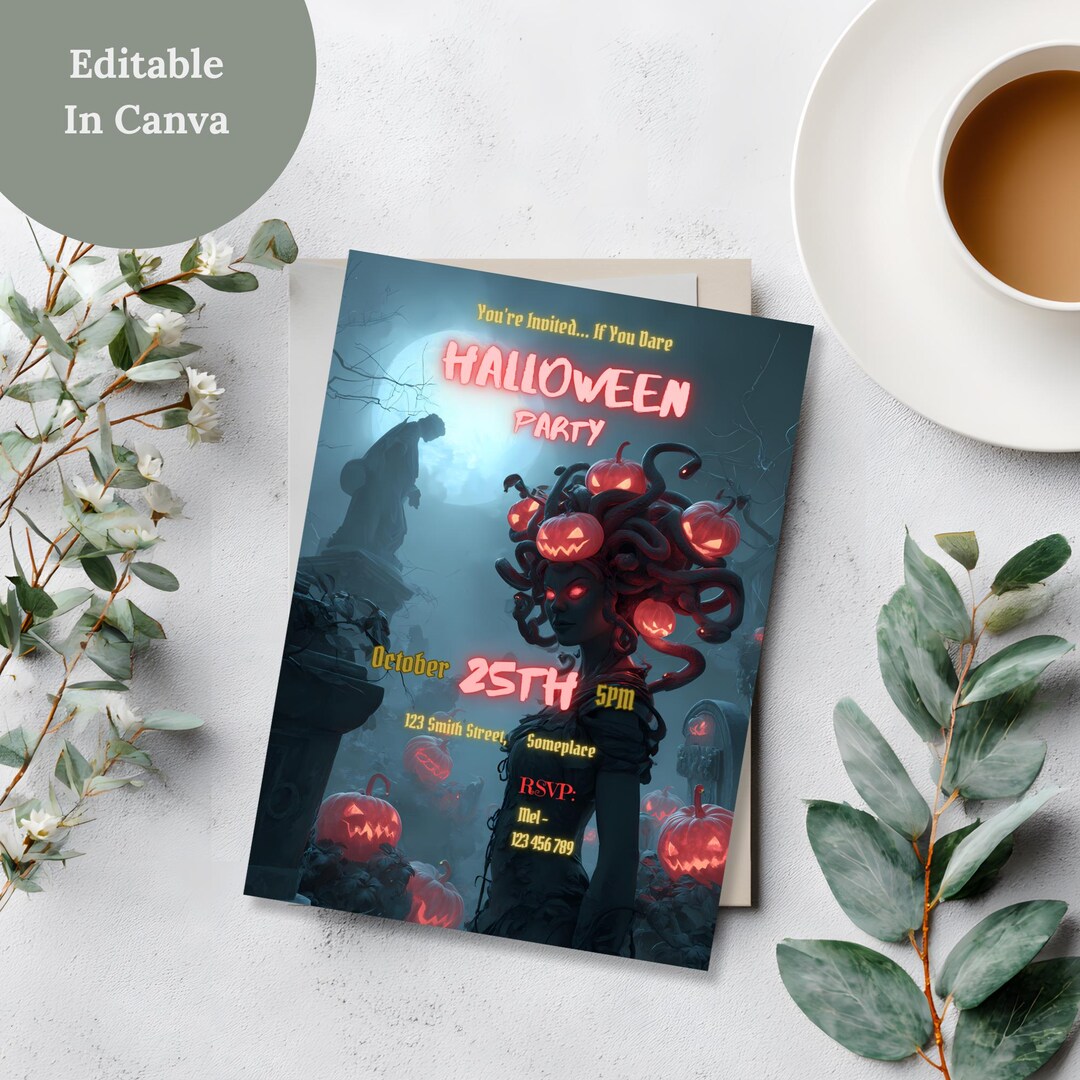 Spooky Haunted Halloween Invitation, Red Medusa Party Invite, Editable ...