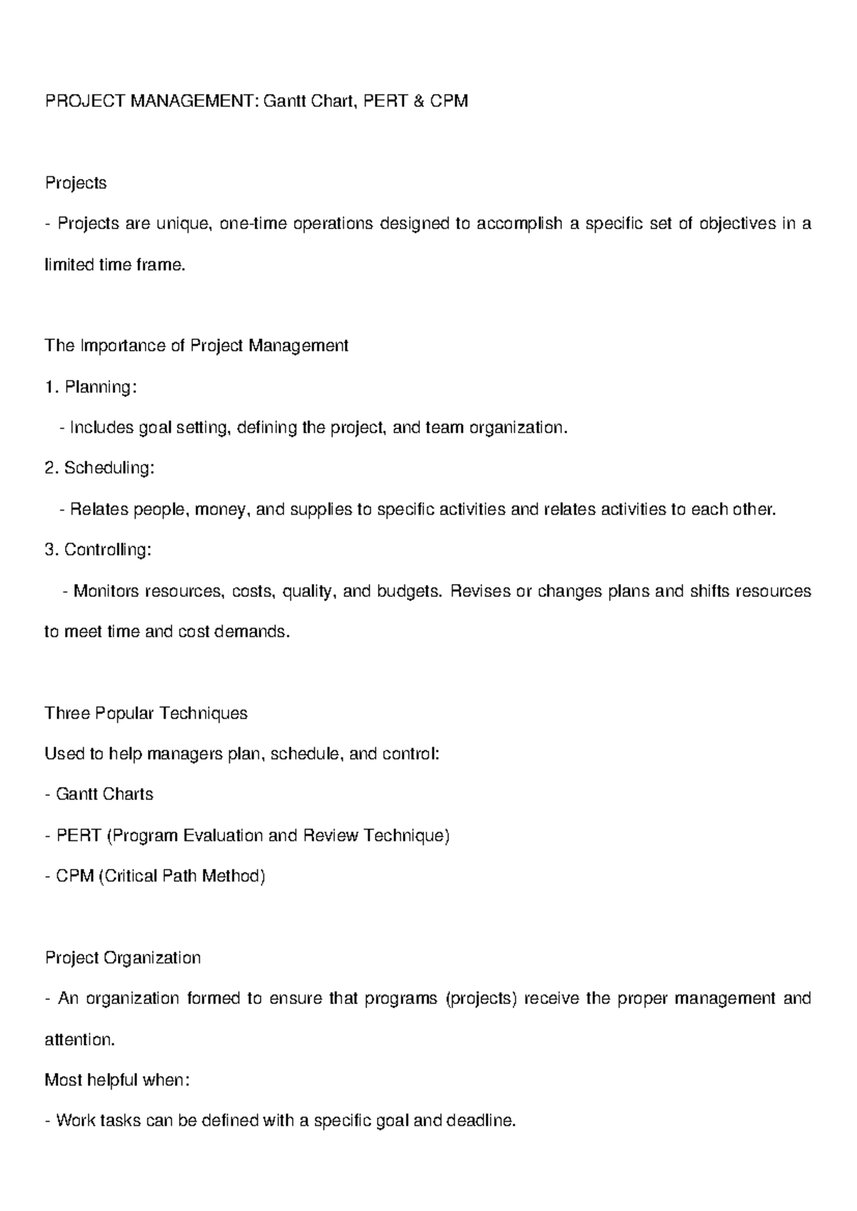 PROJECT MANAGEMENT: Gantt, PERT & CPM Techniques Overview - Studocu
