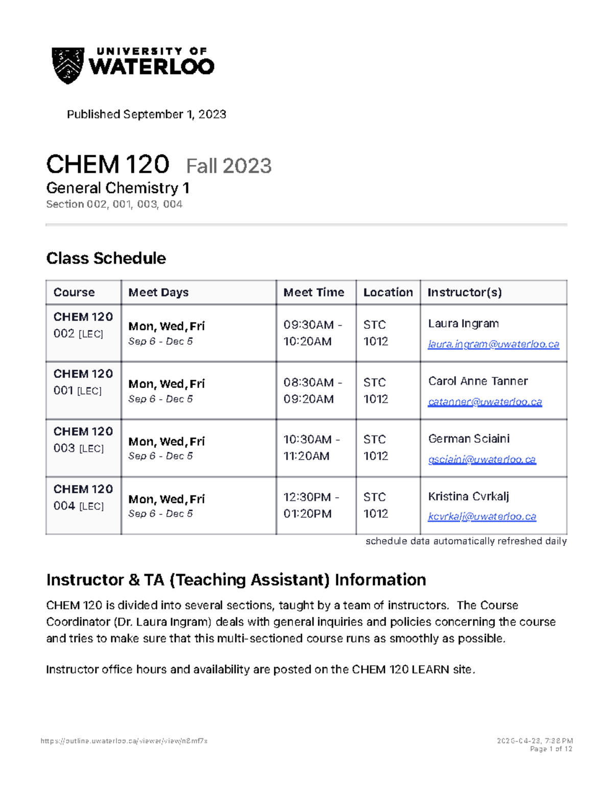 CHEM 120 Fall 2023 General Chemistry 1 Class Schedule & Info - Studocu