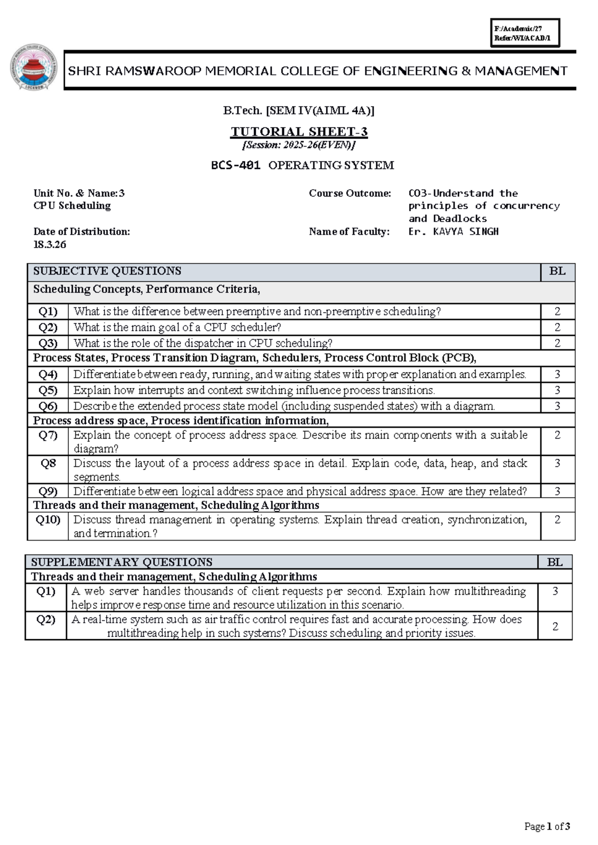 B.Tech. IV (AIML) Tutorial: CPU Scheduling Concepts - BCS 401 ER - Studocu