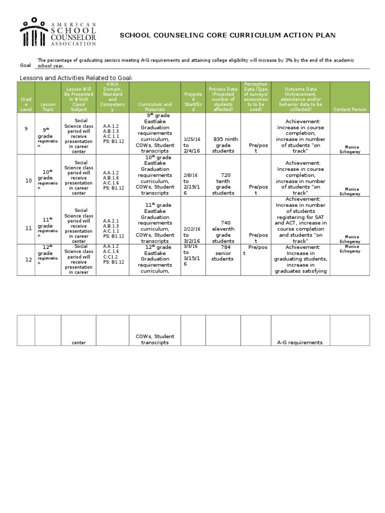 School counseling core curriculum action plan in Word and Pdf formats