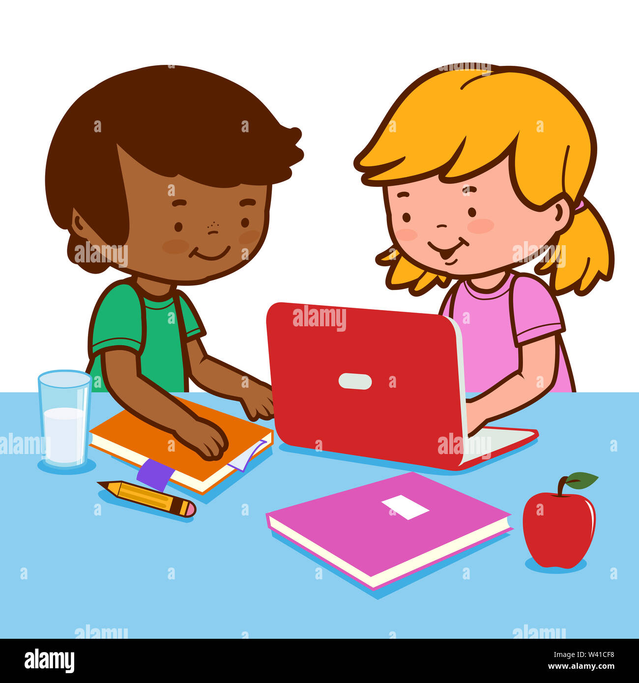 Two school children doing homework together with computer, isolated on ...