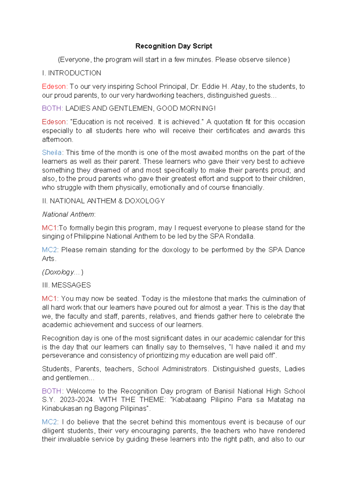 Emcee Script for Recognition Day | PDF